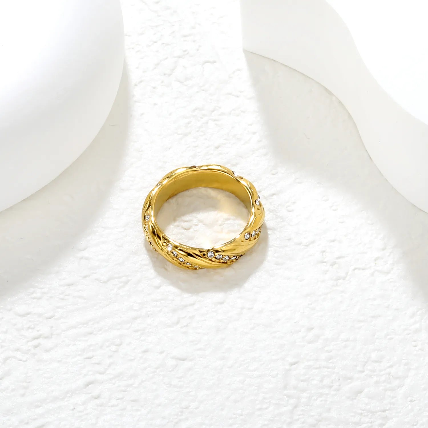 ✨ Wholesale Gold Stainless Steel Brushed Twist Ring | 5mm White/Green Zirconia Stone | Hypoallergenic Statement Ring