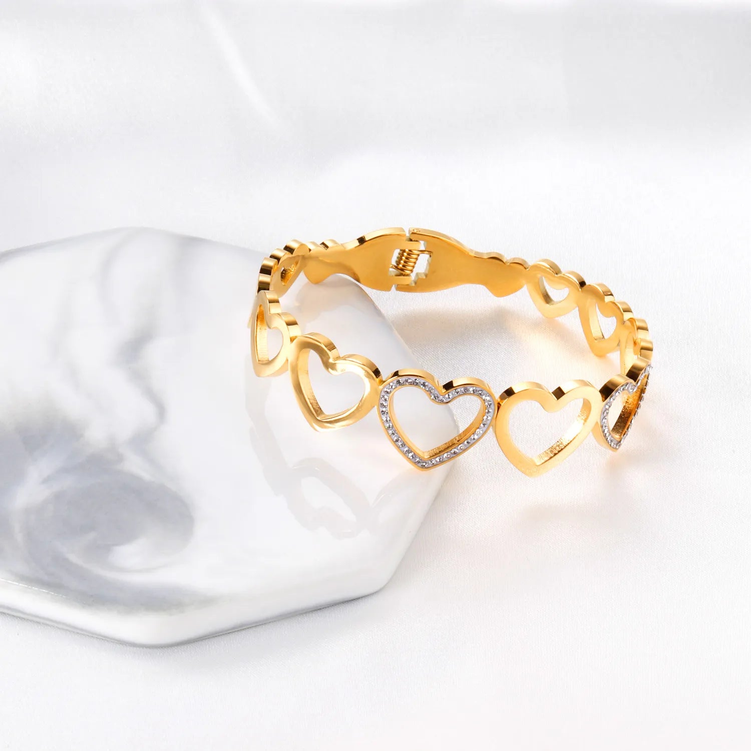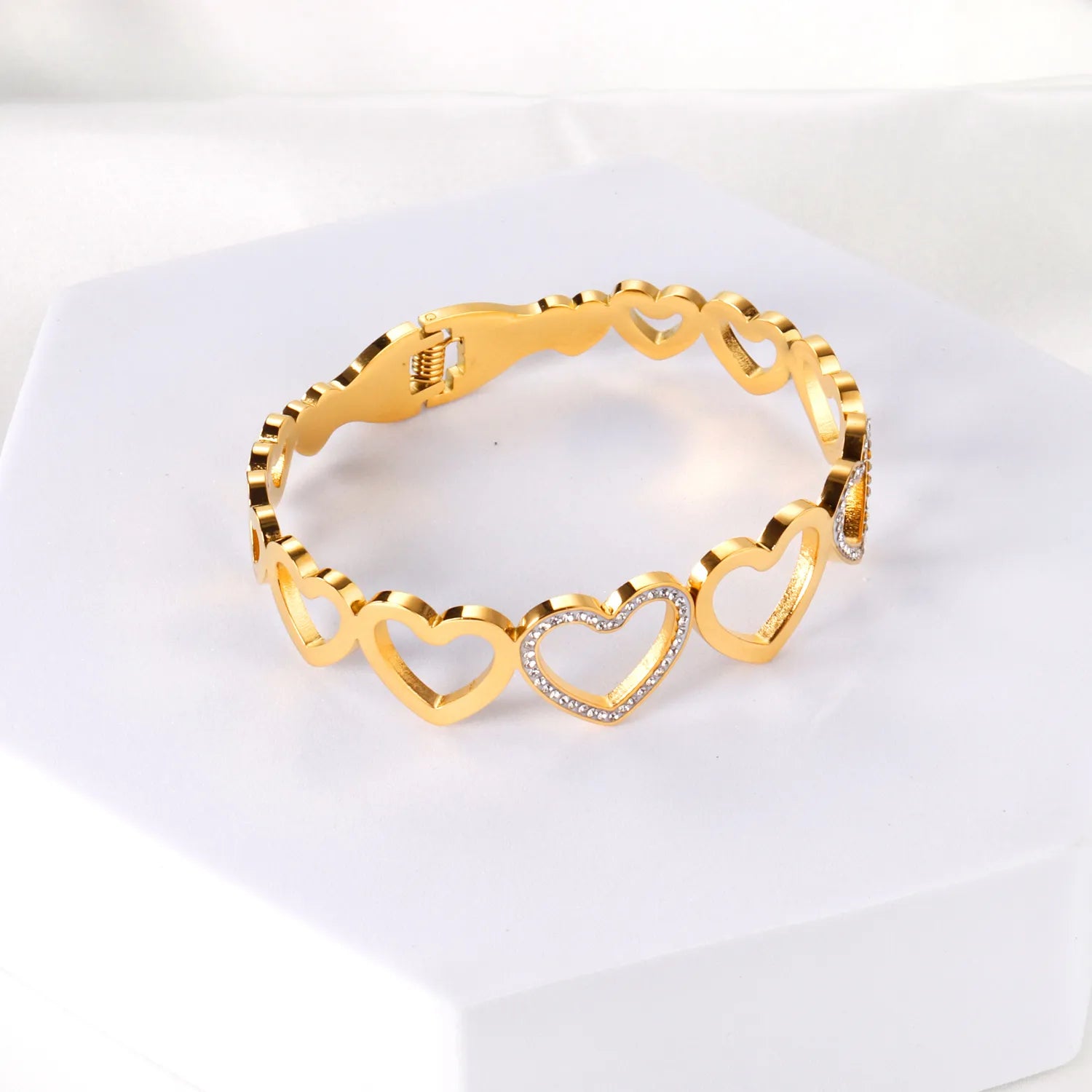 ✨ Wholesale Heart Bangle with Zircon Stones | Big and Small Heart Design | Gold Plated Stainless Steel | Adjustable Love Theme Bracelet