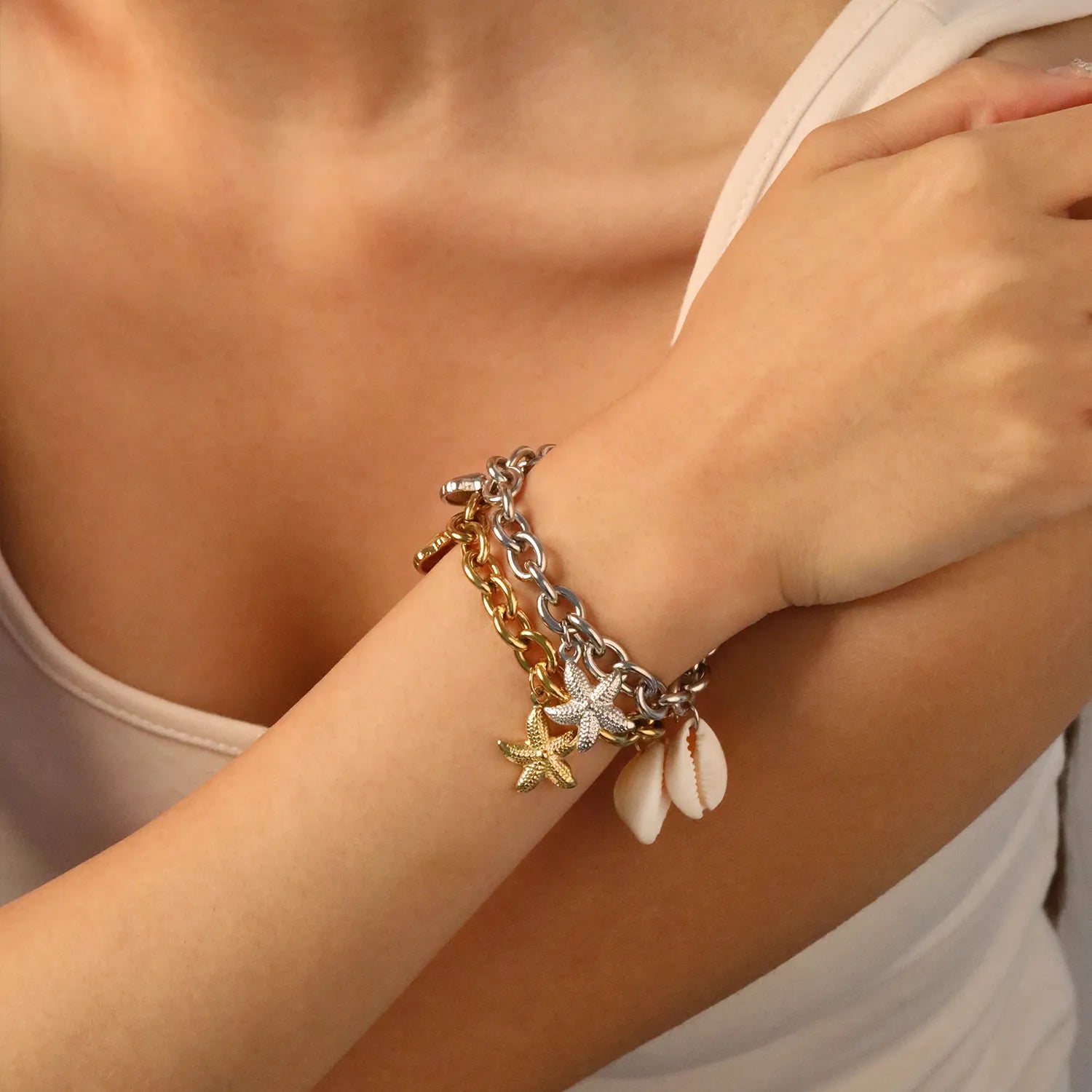 🌊Ocean Charm Bracelet Set Starfish+Scallop+Shell Charms | Stainless Steel Silver/Gold Chain 17+3cm | Wholesale Coastal Jewelry
