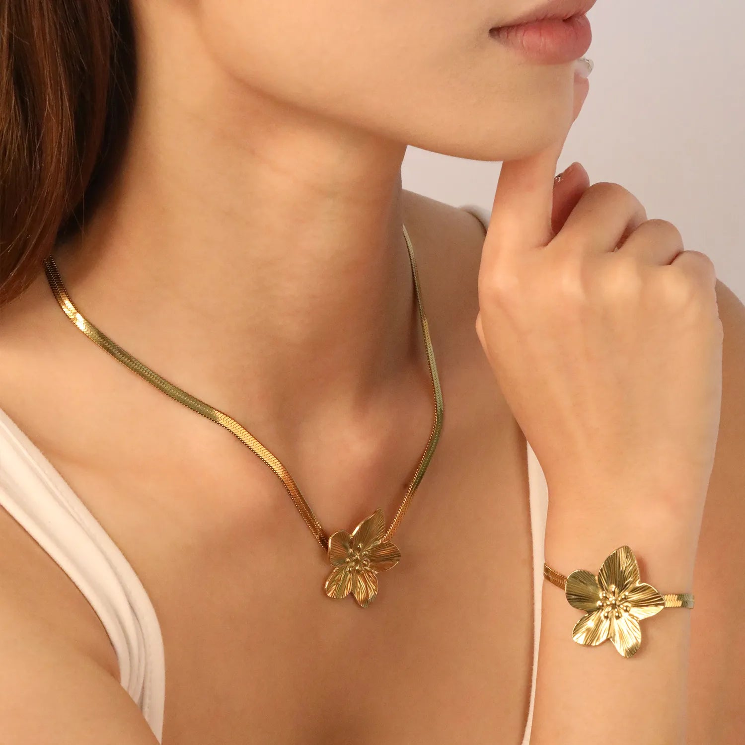 🌸 Wholesale 30.2x32.2mm Floral Pendant Necklace | 4mm Snake Chain 45+5cm | Steel/Gold