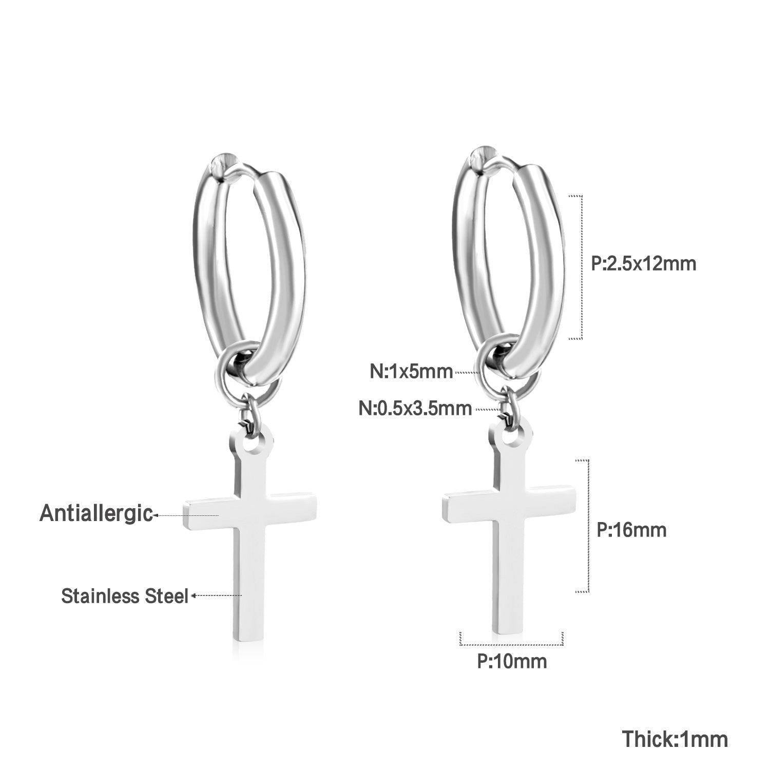 2.5 12mm Internal Wire Earrings-Steel & Gold & Rose Gold & Black Polished + 10x16mm Crosses