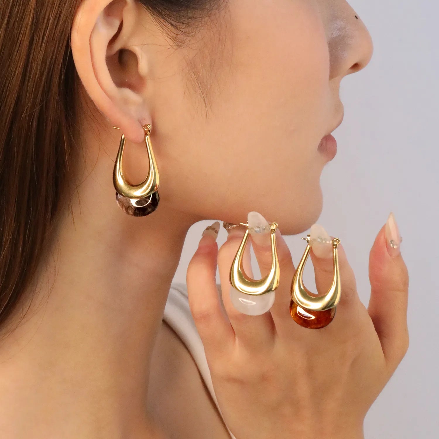 Wholesale Gold Oval Resin Ear Cuffs | 19.4x32.4mm U-Shape | White/Smoky Black/Amber | Stainless Steel Bulk Jewelry