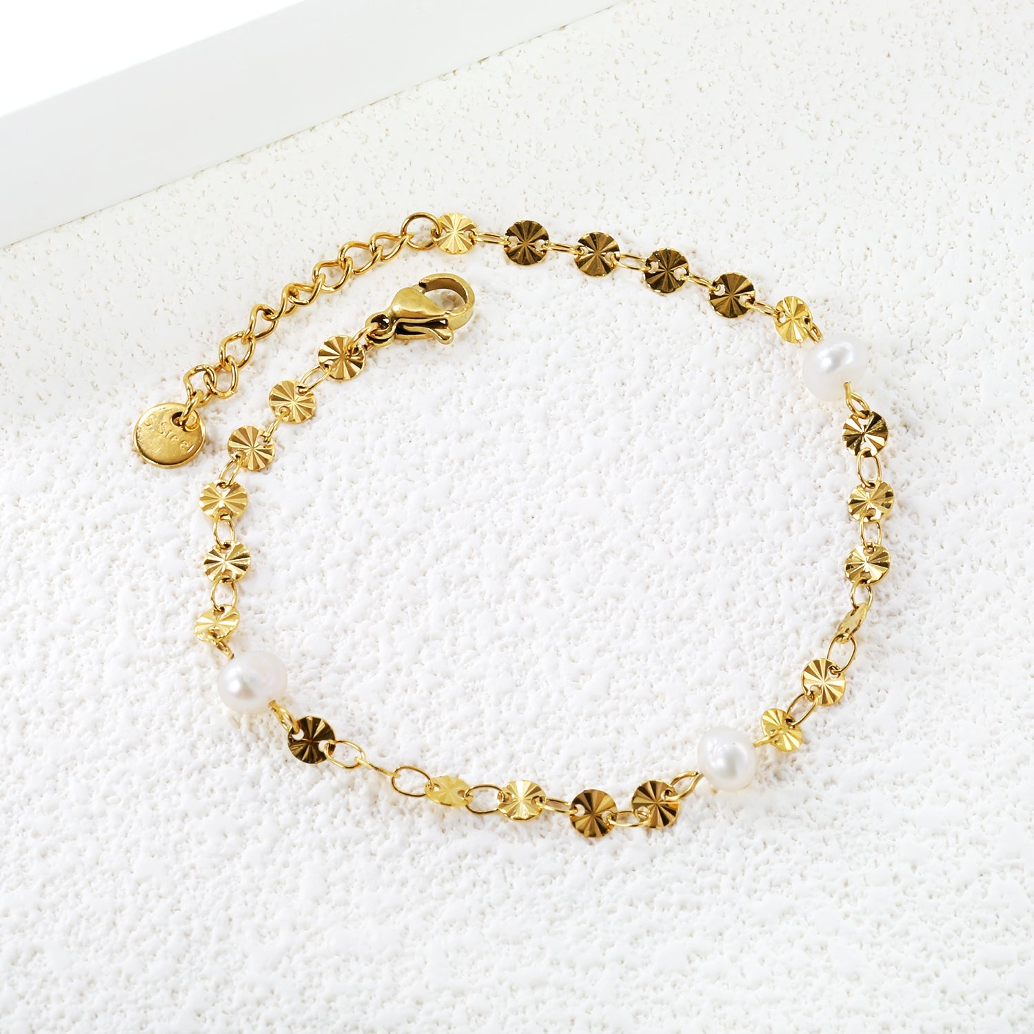 3pcs 5.8*4.6mm freshwater pearls+embossed round cake chain bracelet 17+3cm gold color