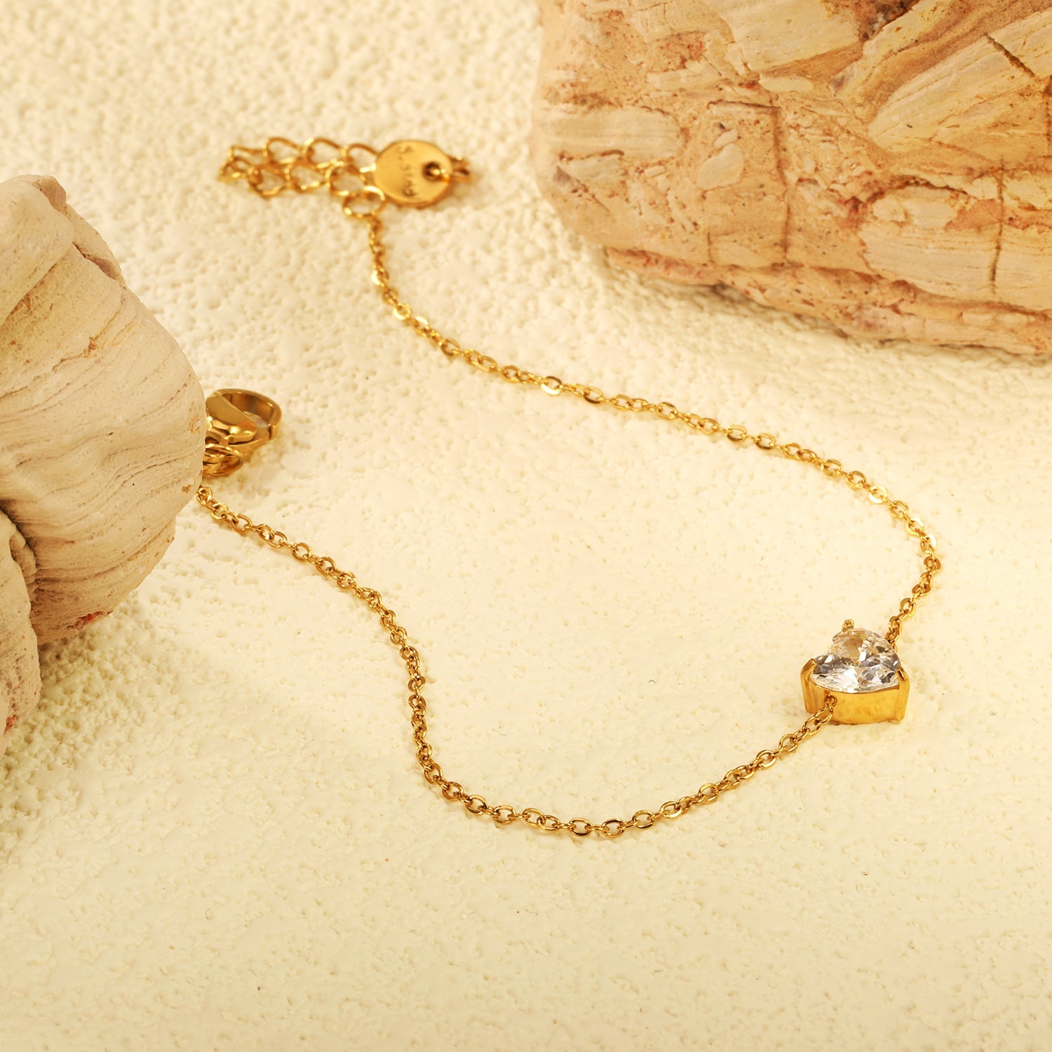 This elegant bracelet features a 6*7mm heart embellished with white zirconium accessories. The 17+3cm adjustable length and 6mm round end plaque provide a comfortable and secure fit. Crafted in a gold color, this bracelet adds a touch of sophistication to any ensemble.