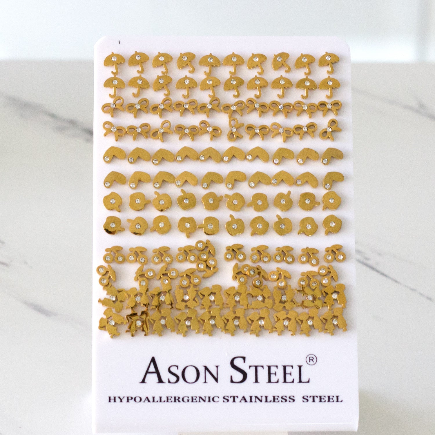 60 Pairs Gold Cut Out Stud Earrings with Diamonds on Card Holder