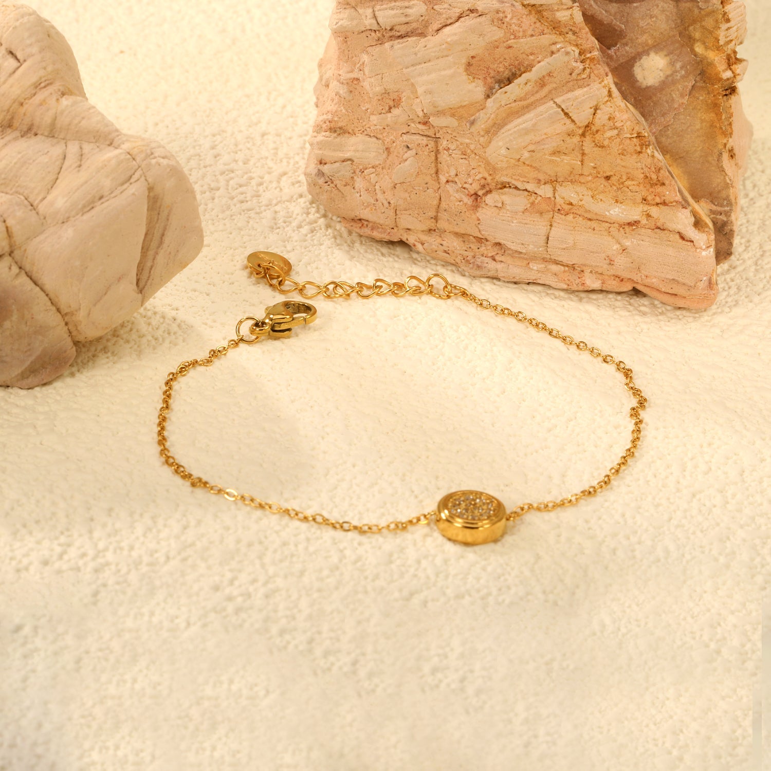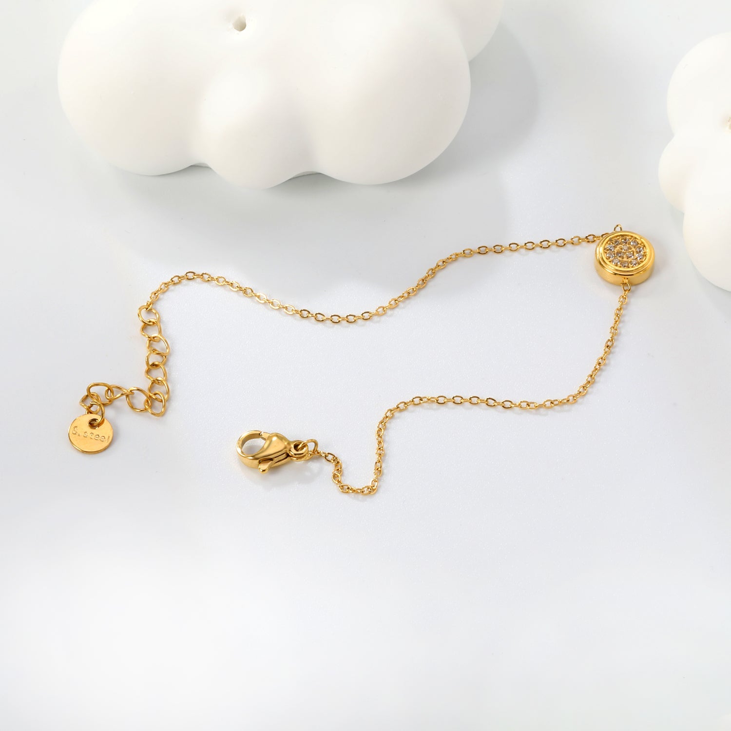 Expertly crafted with 8.5mm convex round CNC zirconium, this bracelet features a delicate 0.3 cross and a stylish 18+3cm+6mm round tail plaque in a rich gold color. Elevate your style and showcase your unique taste with this high-quality accessory.