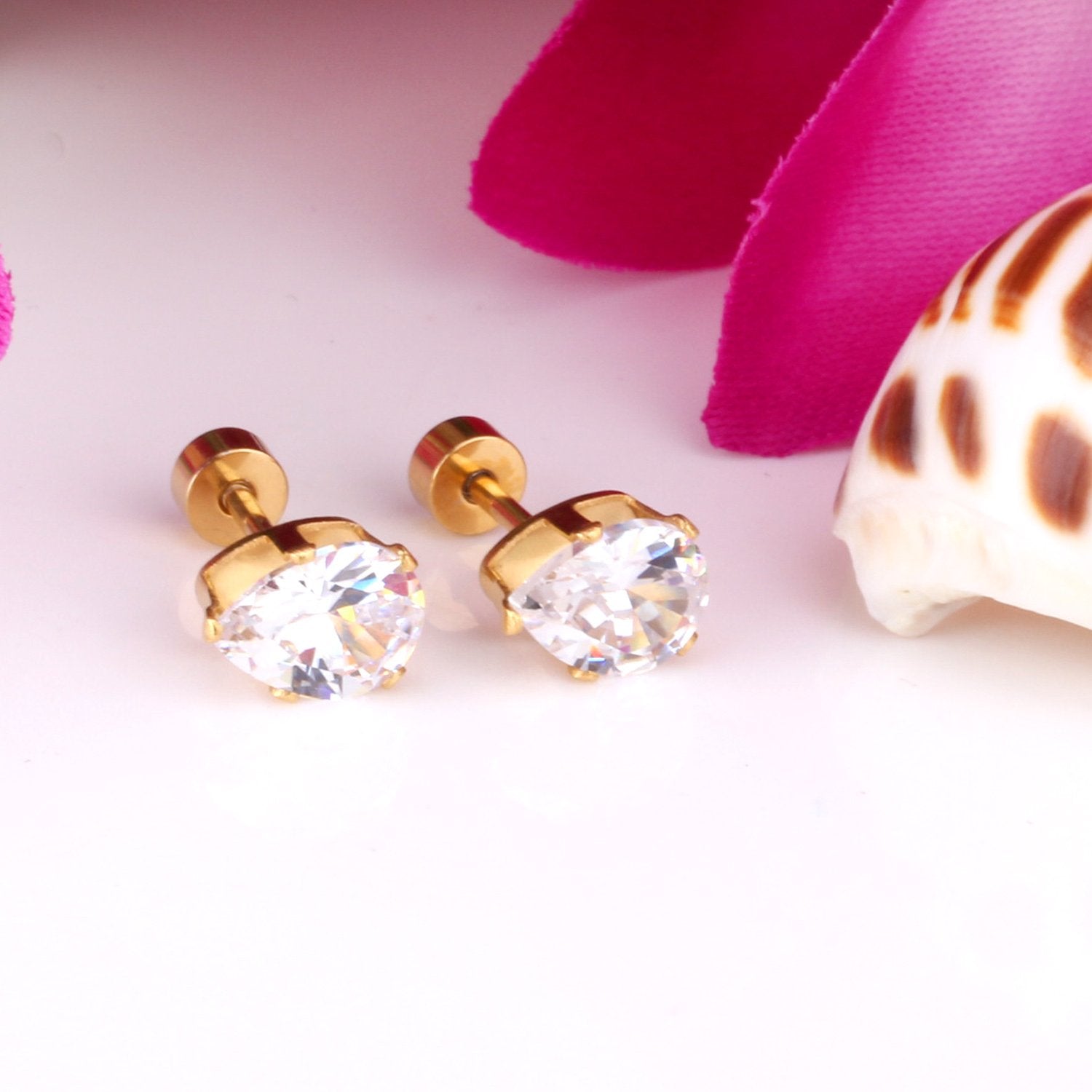 ASON 6mm Water Drop Cubic Zirconia Screw Piercing Stud Earring for Women Gold Color Stainless Steel Earring Fashion Jewelry