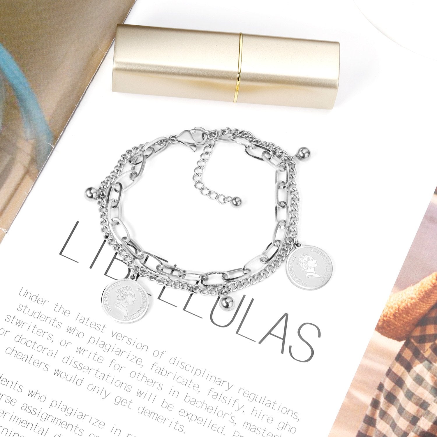 ASON Gold Color Multi-layer Bracelet with Coin Charm Stainless Steel Bangle Bracelets with Lobster Clasp Extender for Women