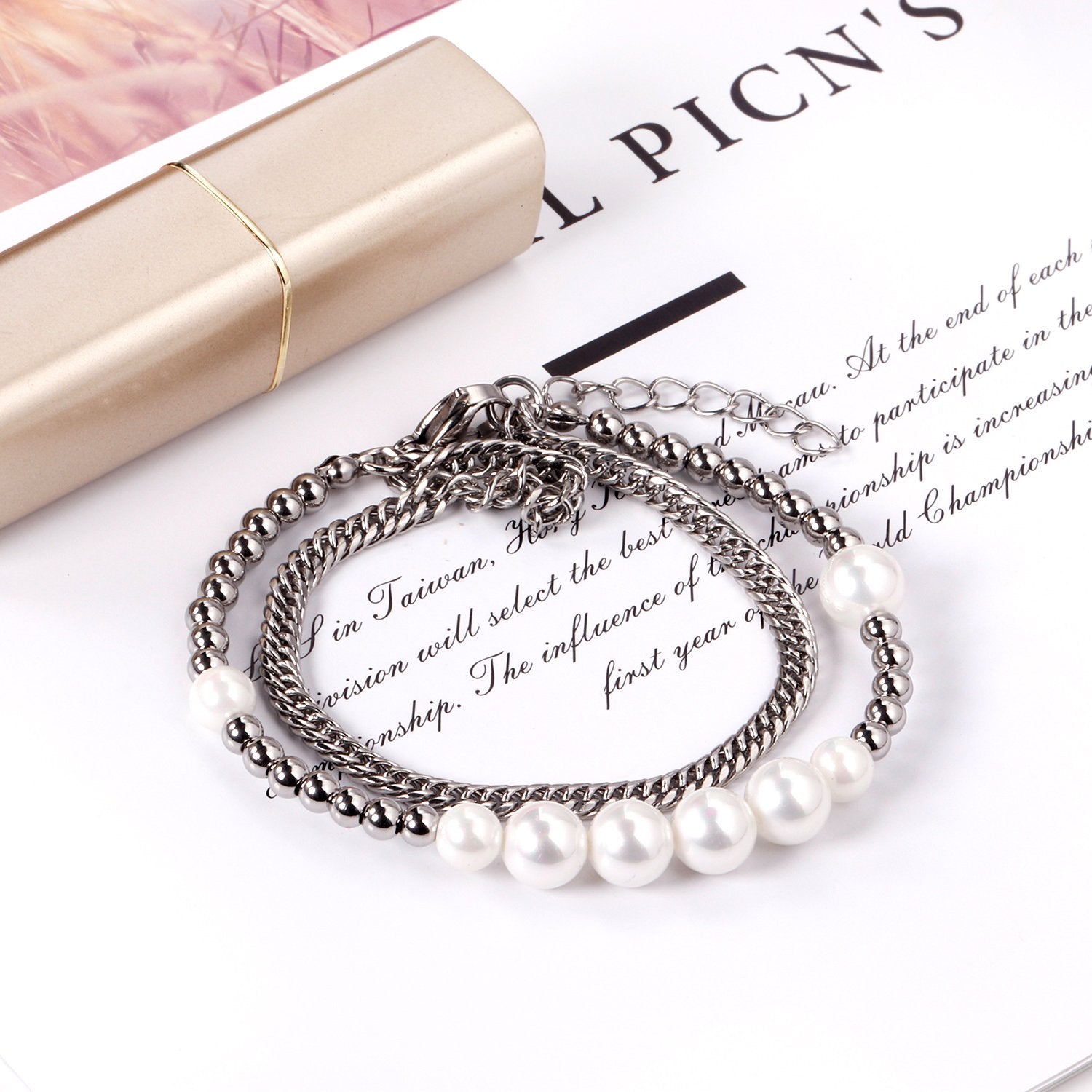 ASON Silver Color Trendy Imitation Pearl Bracelet with Steel Ball Charm Stainless Steel Bangle for Women Fashion Jewelry