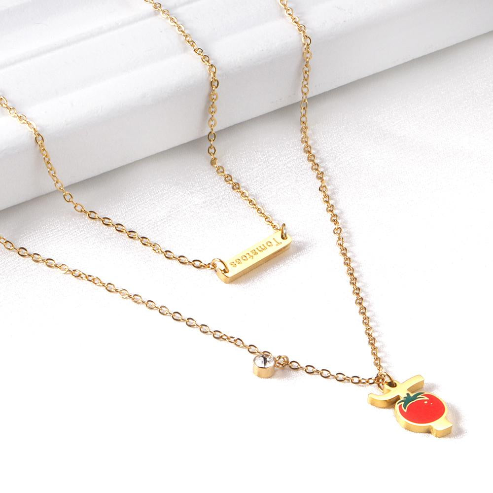 ASON Tomato Pendant Multi Layer Necklace Gold Color Stainless Steel Chain with Cubic Zirconia for Women Girl Fashion Gift