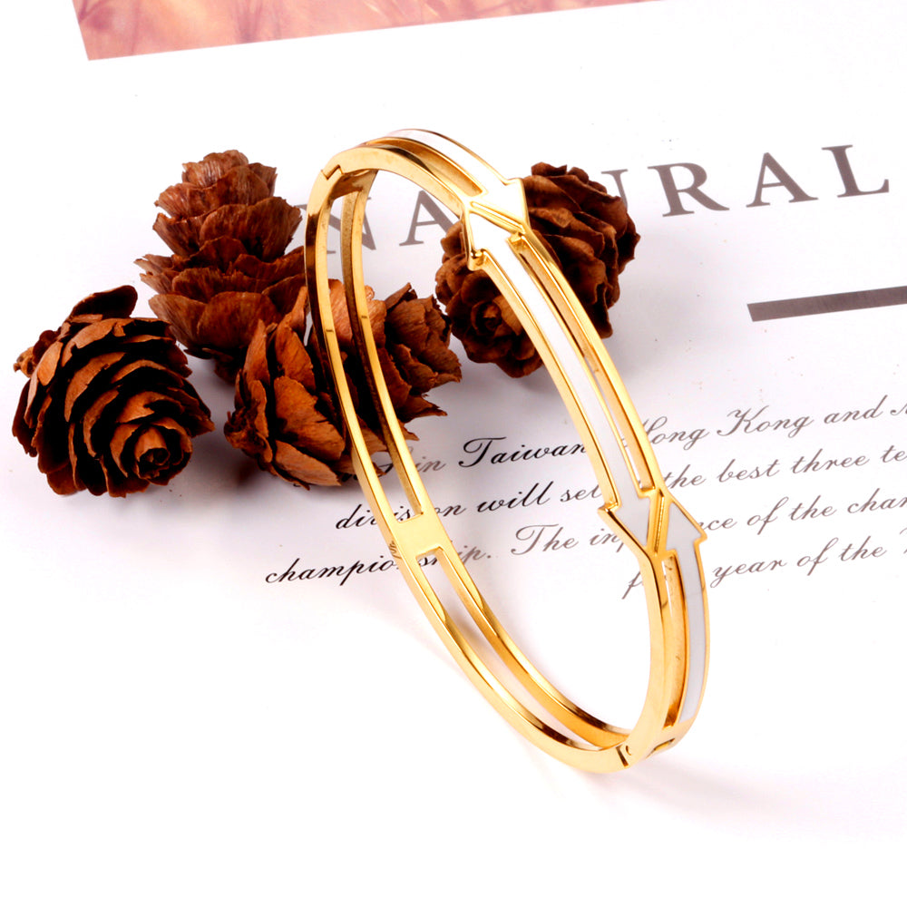 Expertly crafted, this gold colored hard bracelet stands out with its directional arrows and center white oil drip design. Made with precision and adorned with sleek details, it adds a touch of sophistication to any outfit. Made for those who appreciate quality and unique style.