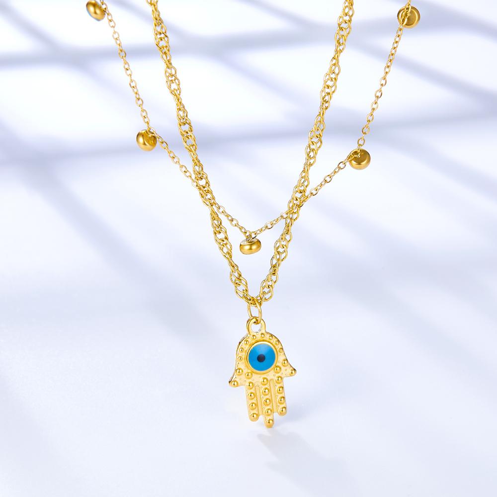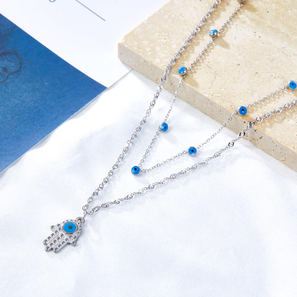 New Hamsa Hand Pendant Necklace For Women Girls Stainless Steel Blue Evil Eyes Double Layer Chain Turkish Luck Jewelry