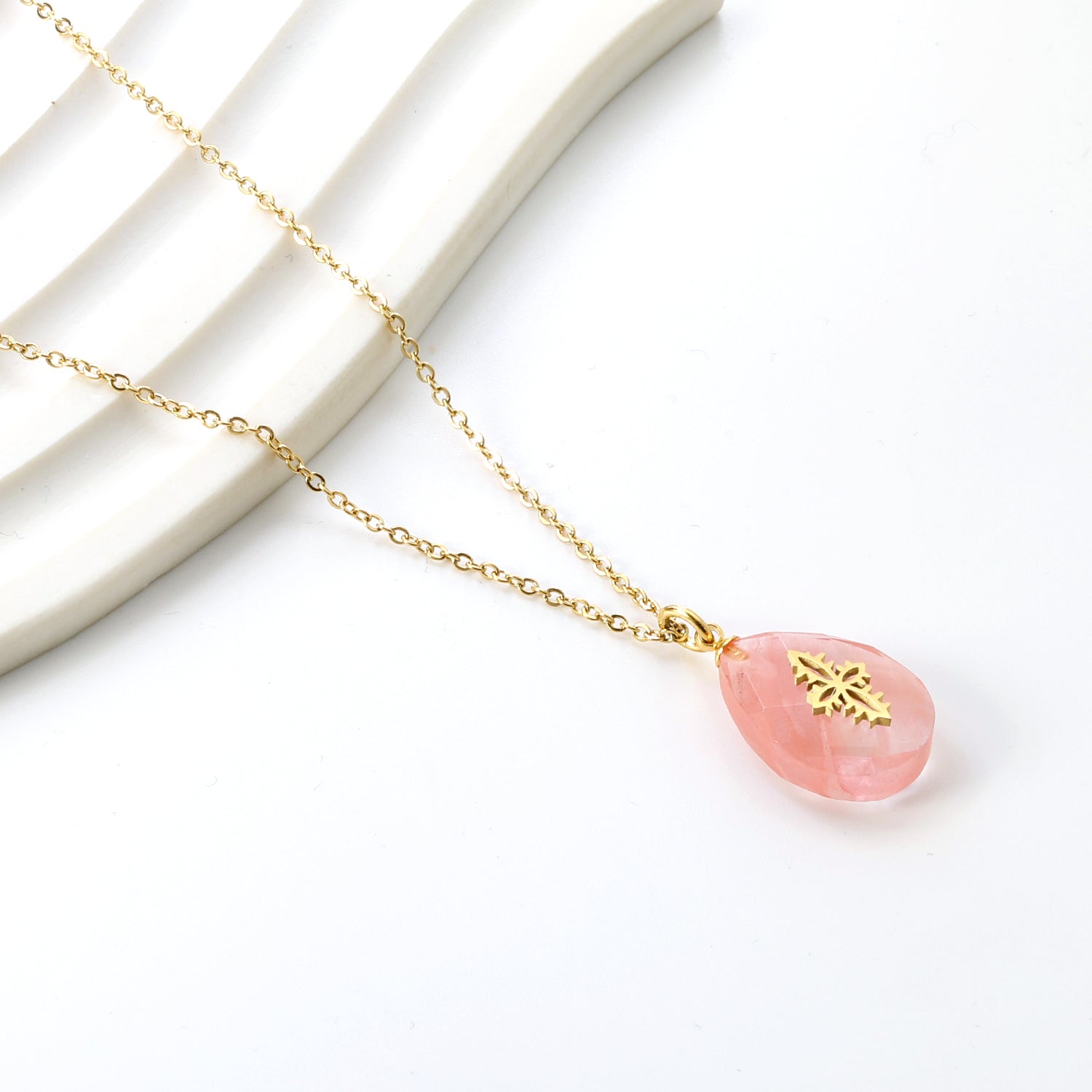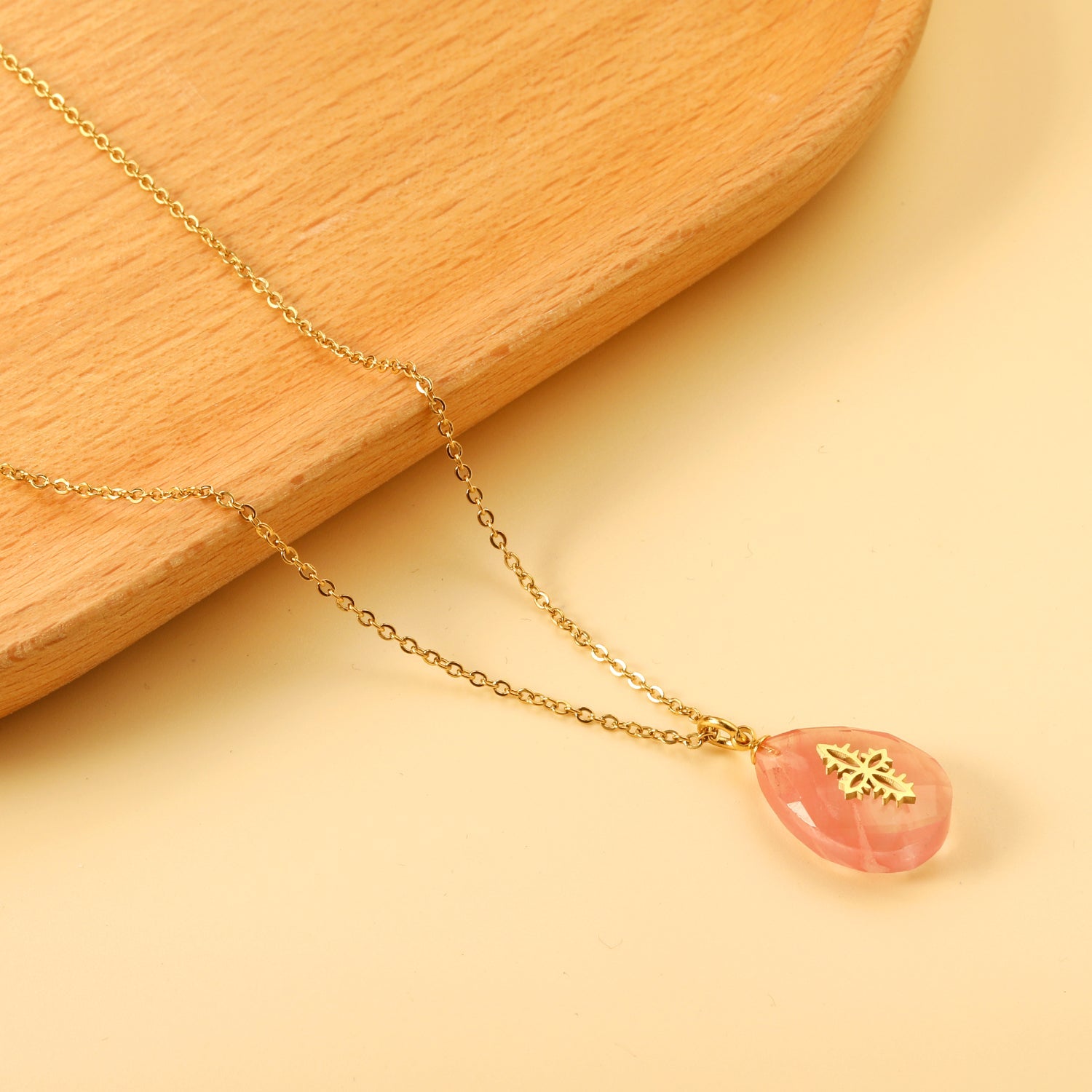 Pink Teardrop Stone with Gold Pattern Pendant 13.4*18.8mm Necklace 40+5cm Golden