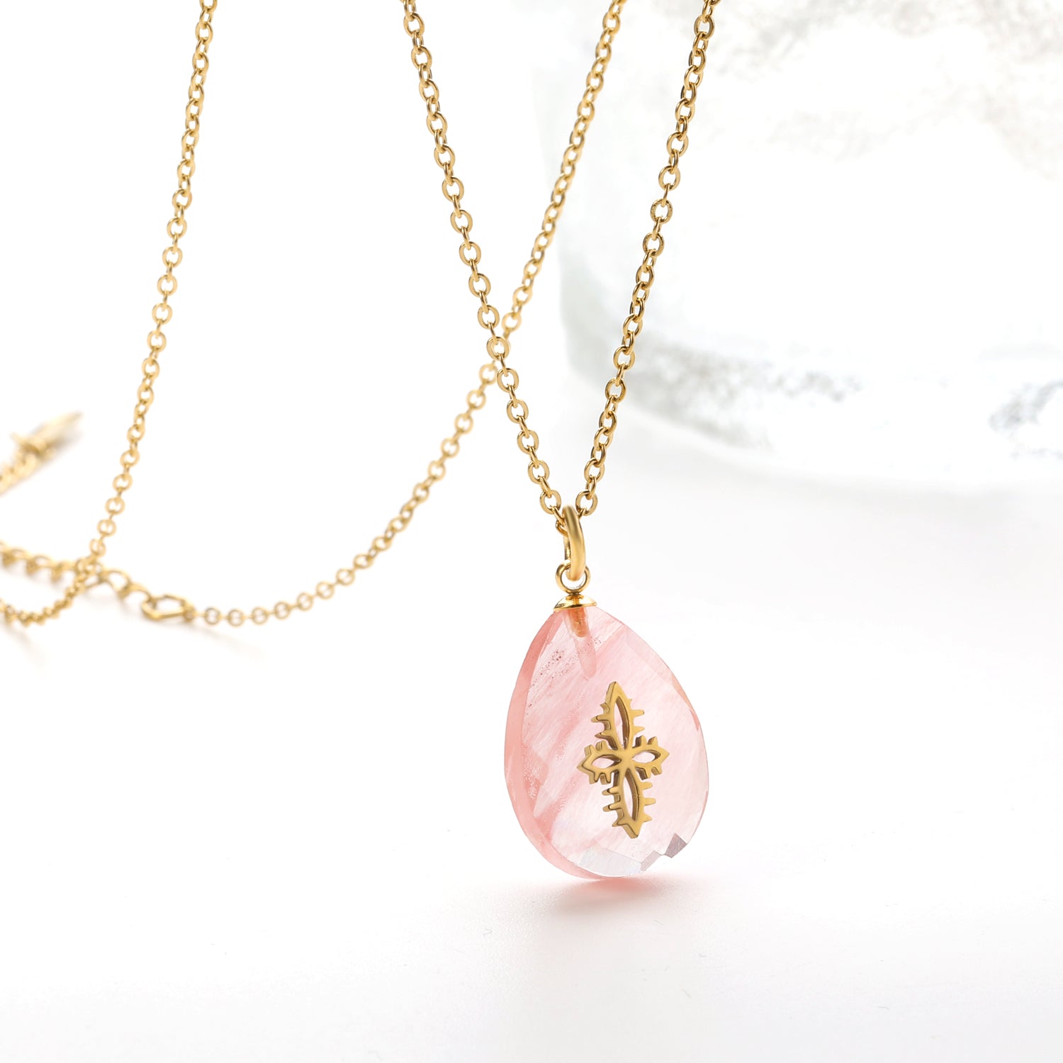 This elegant necklace features a charming pink teardrop stone pendant with a delicate gold pattern, measuring 13.4*18.8mm. The necklace itself is 40cm long with an additional 5cm extension, all crafted in a luxurious golden tone. Add a touch of sophistication to any outfit with this stunning piece.