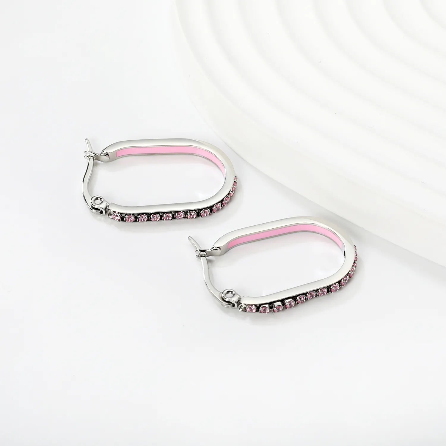 Wholesale Crystal Oval Hoop Earrings Pink Rhinestone Silver-Plated Finish Premium Stainless Steel | 2.26*22mm Size | MOQ 12+