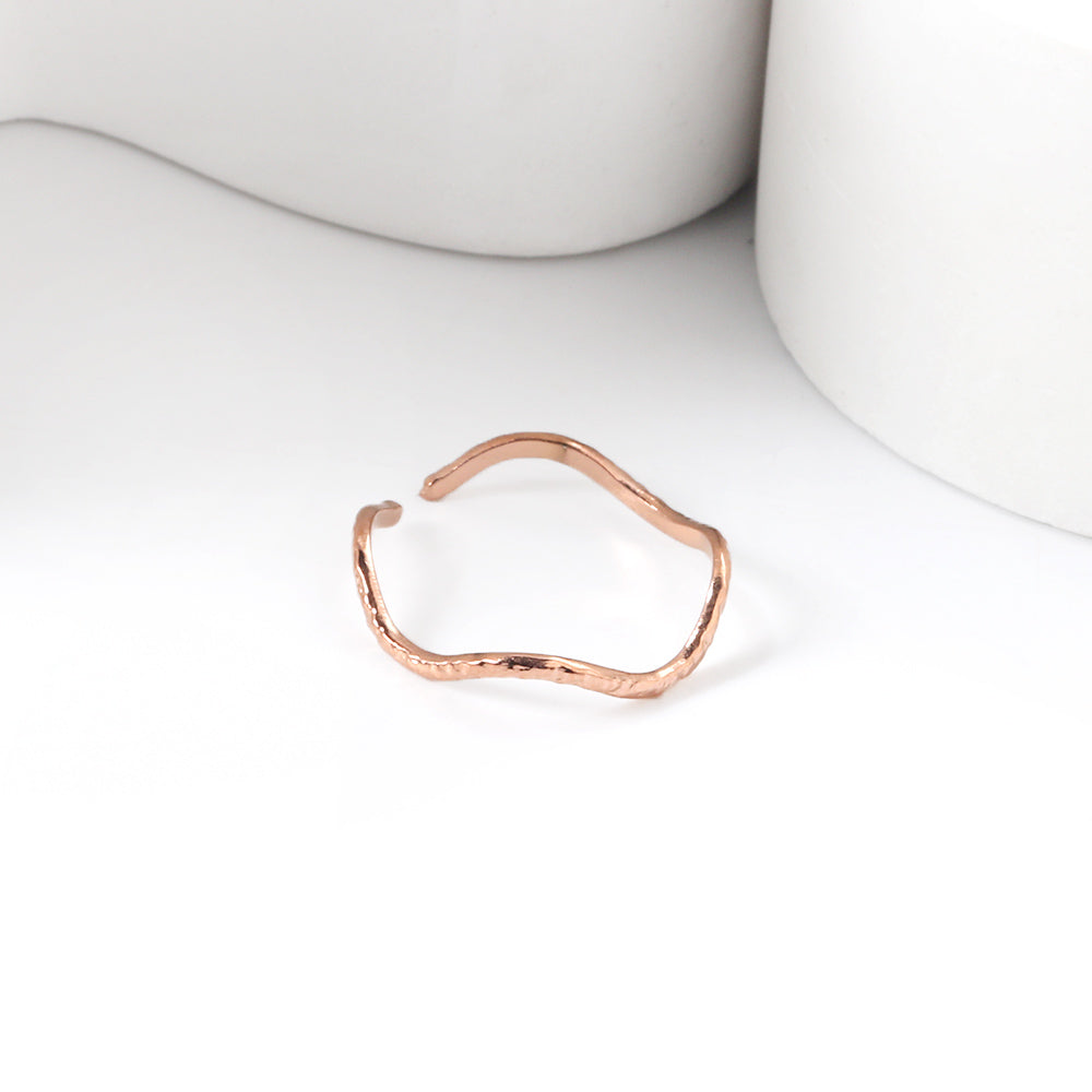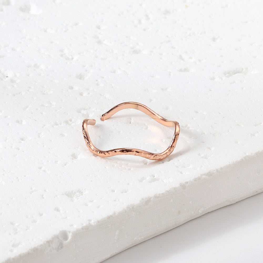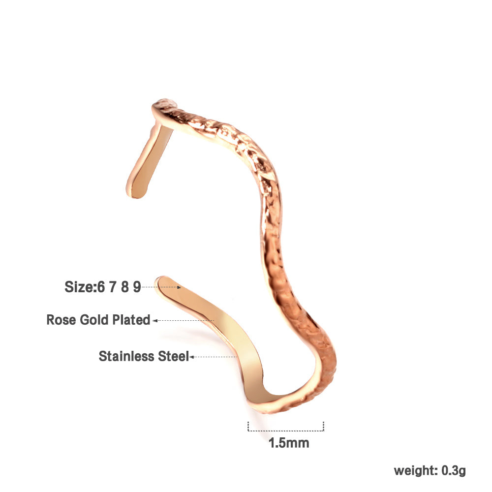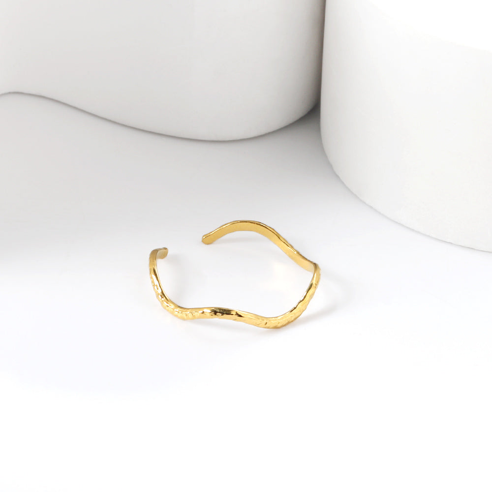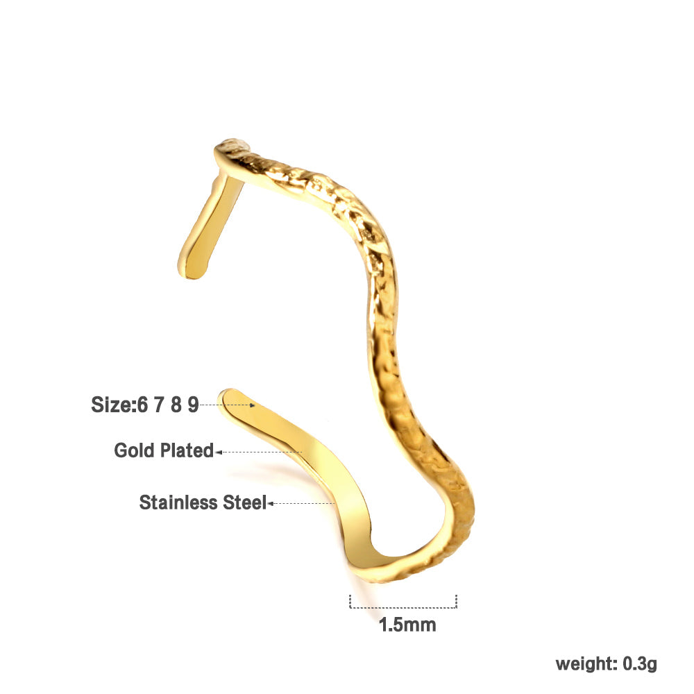 Expertly crafted from durable stainless steel, this 18K gold irregular whacked wave open end ring is a sleek and modern addition to any jewelry collection. Its unique design adds a touch of elegance to any outfit, making it the perfect statement piece for any occasion.