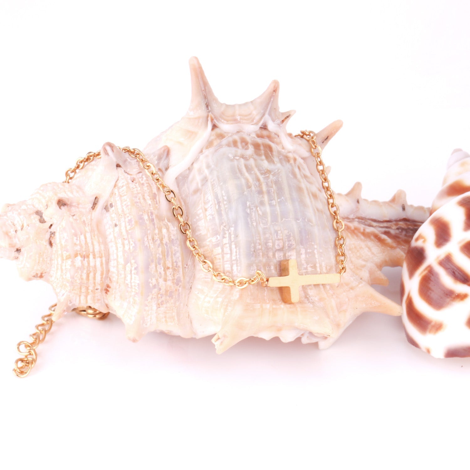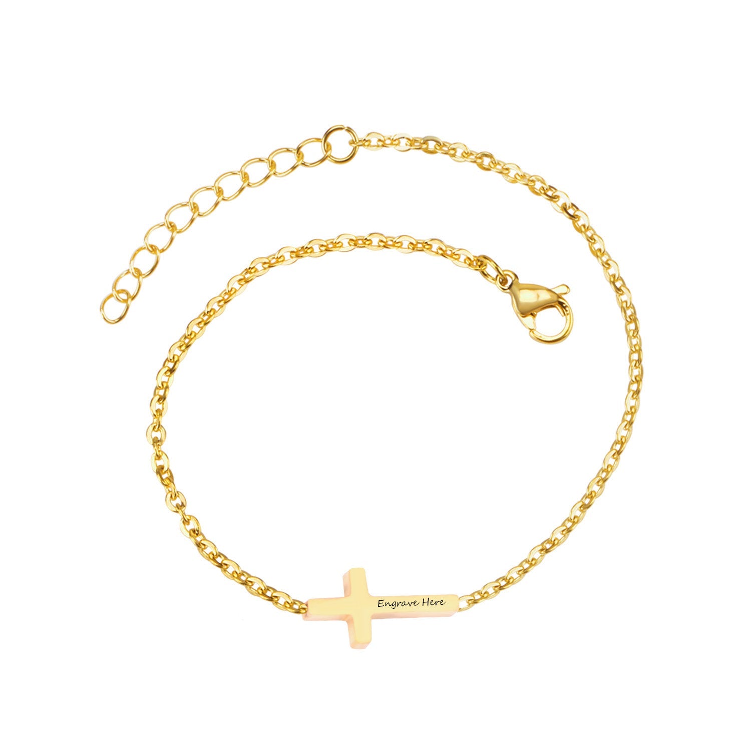 A stylish and versatile bracelet featuring a 12mm steel color gold cross pendant. This accessory is perfect for adding a touch of sophistication to any outfit. With a length of 15+3cm, it can easily be adjusted to fit comfortably on any wrist. A must-have for any fashion-forward individual.