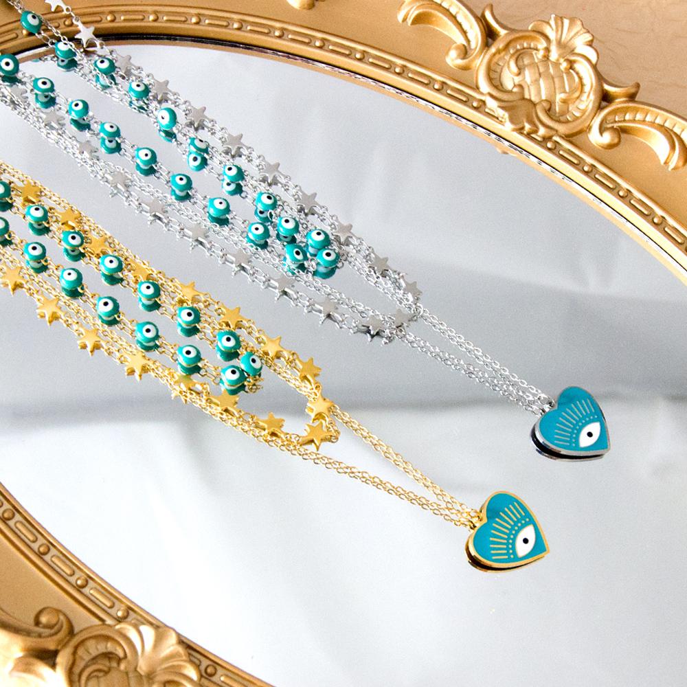 Triple Layered Green Necklaces Heart Eyes Pendant Collier For Trendy Woman Aesthetic Stars Chains Evil Eyes Choker