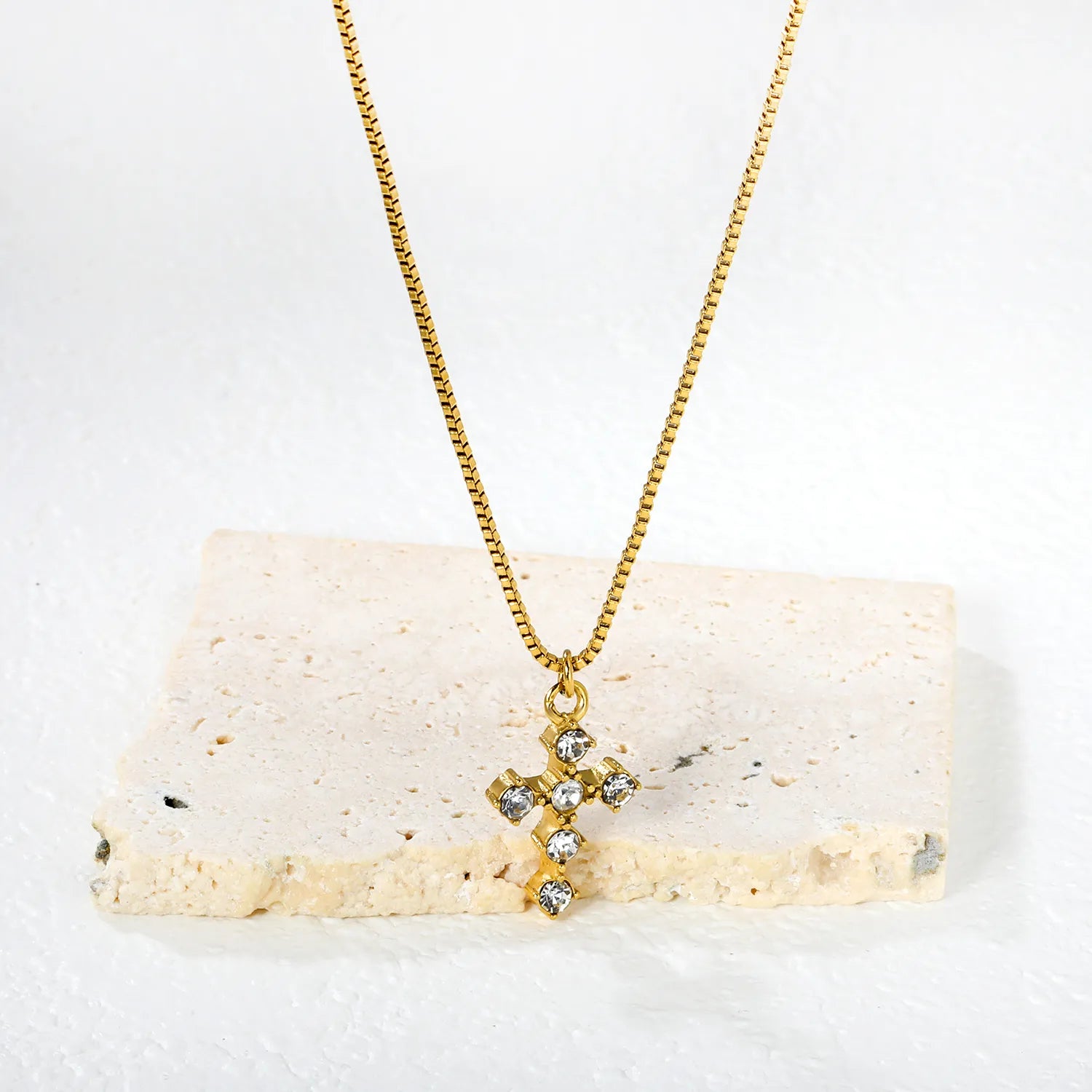 Wholesale 14x19mm Cross Pendant with 7 White Zirconia | 1.0mm Box Chain 40+5cm | Gold Stainless Steel Necklace Set