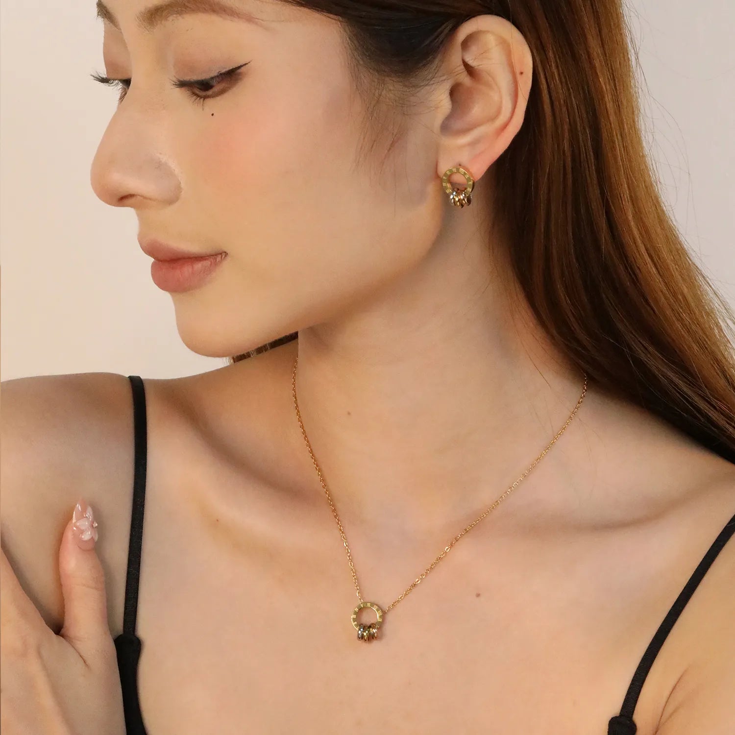 Wholesale Triple Ring Jewelry Set | Mixed Metal Circle Design | 12x12mm Earrings & Pendant | Adjustable 40+5cm Chain
